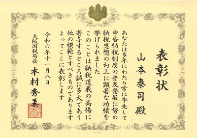2024年11月8日に「令和6年度 大阪国税局長納税表彰式」が行われ、弊社社長 山本泰司が、多年にわたり申告納税制度の普及に努め、納税思想の高揚に功績があったとして大阪国税局長より表彰されました。