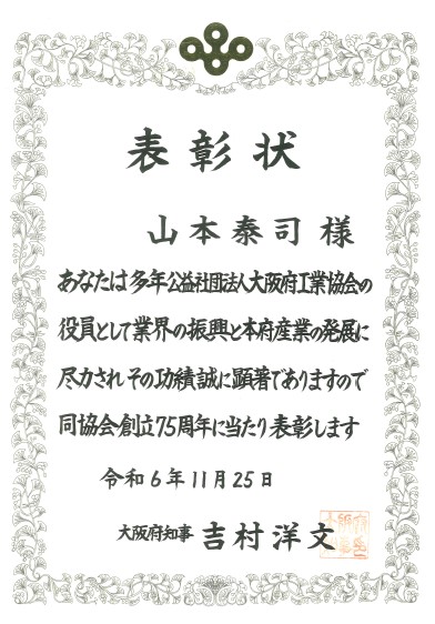 2024年11月25日に弊社社長 山本泰司が、多年にわたり公益社団法人大阪府工業協会の役員として、業界の振興と大阪府の産業の発展に尽力したとして大阪府知事より表彰されました。