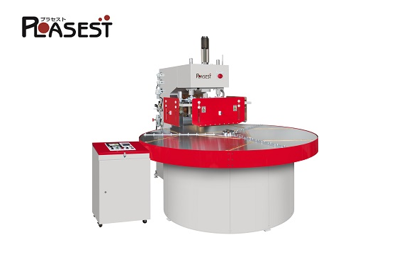 ロータリー式高周波ウェルダーです。この機械は、3面ロータリー式以外にも4~6面にすることも可能です。またオプションとして投入搬出装置を取り付けることにより、省力化を実現します。