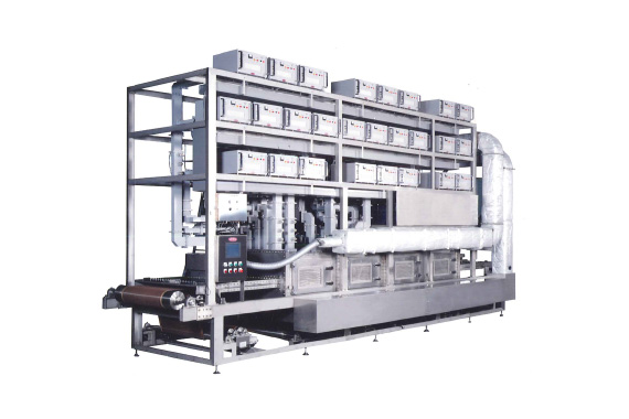 2450MHzのマイクロ波トンネルです。トンネル内を2~3室のオーブンにわけて、マイクロ波出力だけでなく、温度湿度条件を部屋ごとに制御することも可能です。熱風循環装置により炉内温度を目的温度に保ちながら、被乾燥物から発生するガスなどを効率的に外部に排出することができます。