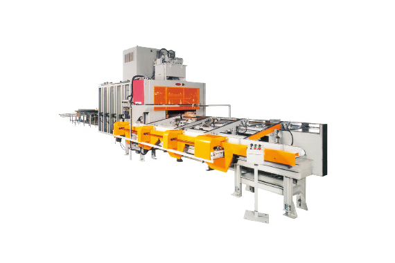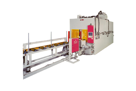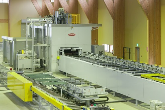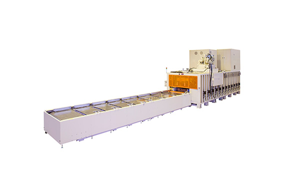 高周波加熱条件や圧力設定すべてを自動でおこない、加工サイズの変更に伴うセット替えが大幅に軽減。多品種少量に対応しており、中小断面や大断面の集成材の接着も可能です。水平方向にラミナーを積むことにより接着剤の糊垂れや付着が少なくメンテナンス性に優れています。