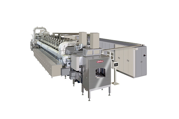 915MHzのマイクロ波を使った連続乾燥機です。2450MHzと比較して大容量、サイズの大きな被乾燥物の乾燥に適しています。1台で最大出力100kWと大型の発振器を使うことで、大出力での大量処理乾燥を実現します。熱風循環装置により炉内温度を目的温度に保ちながら、被乾燥物から発生する水蒸気を効率的に外部に排出することができます。