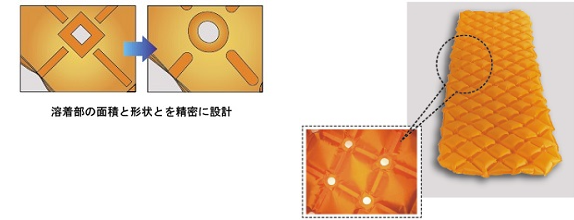 シート加工は2次元でおこないますが、実際にエアーを入れ加圧すると立体の3次元になり、アーチ状に反り返ったり、捻じれたりと変形が起こるといった課題がありました。そこで、求める立体形状に合わせて、溶着面積や溶着形状を変更したり、隔壁などのパーツを追加したり、素材の厚みを変えたりと繰り返し調整を行うことでお客様の理想の形状を実現しました。