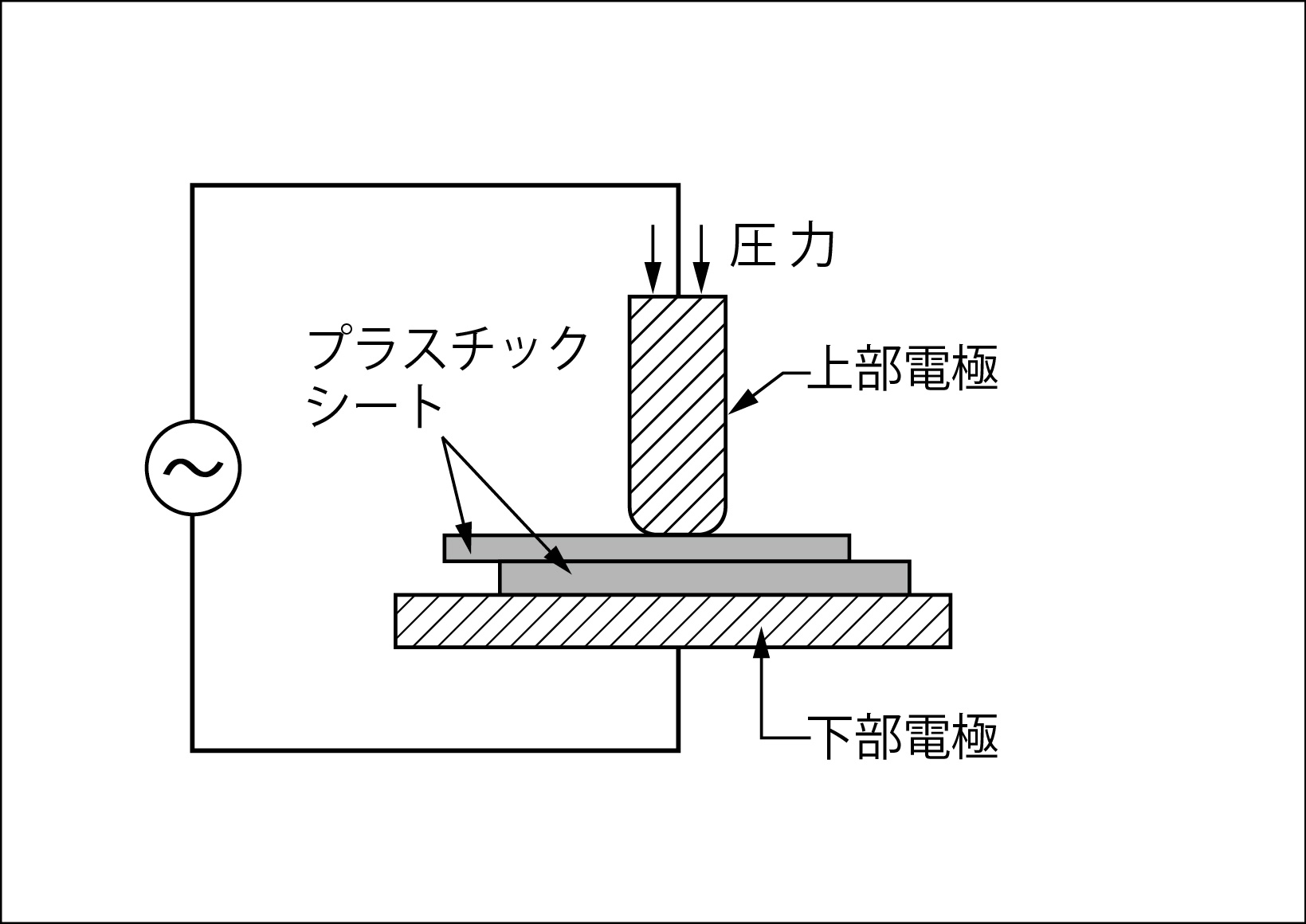 塩化ビニル(PVC)やポリウレタン、EVAなどの熱可塑性プラスチックシートの溶接には、高周波誘電加熱が最も適しています。プラスチックシートの溶接をウェルダー加工と言い、その加工装置を高周波ウェルダーと呼びます。高周波ウエルダーの装置は、高周波誘電加熱装置の中では最も多く稼働しており、全国で数万台に上がるものと見られます。