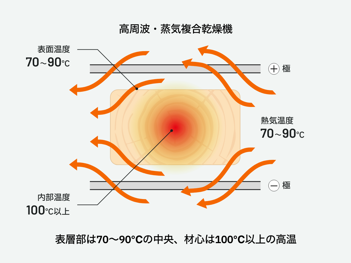 複合乾燥は、一般的な蒸気式乾燥(外部加熱)に高周波加熱(内部加熱)を併用し、お互いの利点を組み合わせたものです。乾燥機内は、70~90℃程度の中温度の熱気乾燥を進めながら、同時に高周波加熱により水分の多い材心部を選択的に100℃程度に昇温します。