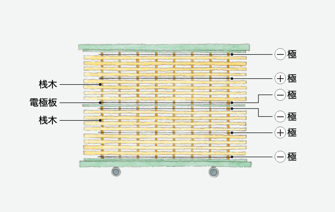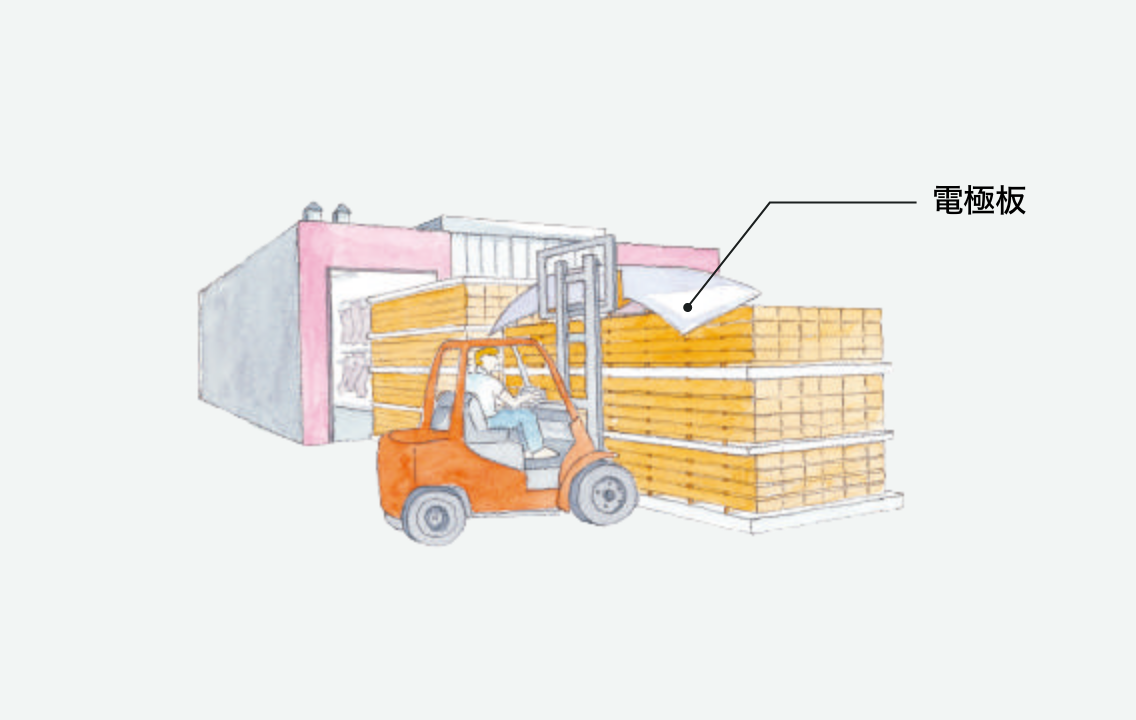 桟積み間に高周波電極板を挟み込み、高周波誘電加熱を行います。