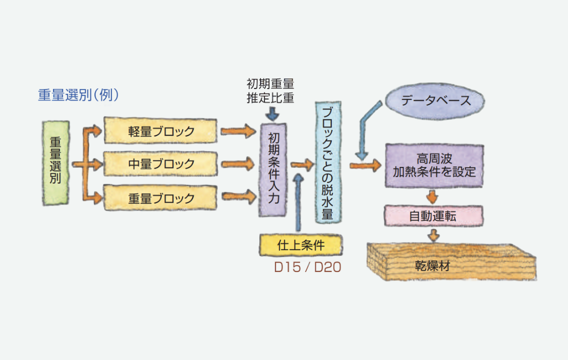 グループ別に乾燥に必要な脱水量を計算し、適切な高周波電力量を自動調整します。