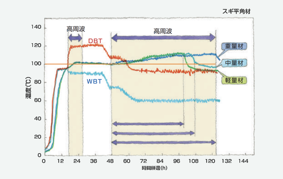 外部の熱気温度と木材内部温度に温度勾配が発生し、内外面に優位な圧力差が発生することにより、材心部の水分が外側に向かって積極的に押し出されます。この結果、乾燥の迅速化が進められ、また水分傾斜が容易に解消され、均一な乾燥が実現されます。