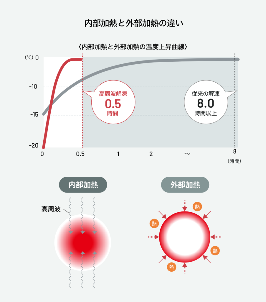 従来の「外部加熱」は、冷凍品の外部から加熱し、熱を外部から徐々に伝えて解凍します。このため、時間を要する上に、冷凍品の熱伝導性により効率が左右され、解凍ムラ、ドリップロスが生じがちでした。