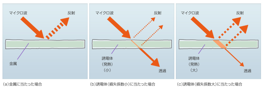 マイクロ波は誘電体に殆ど吸収され(誘電体の損失係数の大きさに左・右される)誘電体自身を加熱し、吸収されなかったマイクロ波電力は透過する。この場合でもマイクロ波は物質の両面にて反射し、その程度は損失係数が大きいほど反射率は大きくなる。尚、マイクロ波が物質表面に入射する角度によって反射率は変化するが、詳細は省略させていただく。