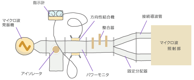 マイクロ波加熱装置を構成する基本的な機器類は、マイクロ波エネルギーを発生するマイクロ波管であるマグネトロン或いはクライストロン、それらマイクロ波管を収容及び動作させるための電源・制御部などを収容したマイクロ波発振機、被加熱物にマイクロ波エネルギーを照射し加熱処理する部分であるマイクロ波照射部(オーブン)、マイクロ波発振機からマイクロ波照射部へマイクロ波エネルギーを伝送する接続導波管、加熱システムを制御する操作・制御盤などから成っている。尚、接続導波管の途中には必要に応じてアイソレ-タ、パワ-モニタ、整合器、固定分配器、マイクロ波切替器、スライド導波管、可撓導波管などを装着する。
