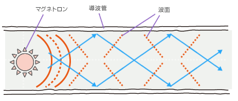 導波管は既に説明したように周囲を導体で取り囲まれた中空パイプで、このパイプの中をマイクロ波は伝播してゆく。この導波管内のマイクロ波の伝播は、管内を真直ぐに伝送するように思われる。この場合、管内と管外の同一距離を電波が進む時間は等しくなければならないが、実際は管内を進行する場合の方が余計時間がかかる。これは管内の方が電波の通路が長いからと考えるべきで、図10.3.1 のように電波は管内の左右の壁 (短辺)にぶつかり反射しながら進む2つの平面波から成り立っていると考えられる。それぞれの電波の波面は常に進行方向に直角な平面内にあり、これらの2つの平面波が重なり合い導波管内で特有の電磁界分布を形成、結局この合成された電磁界分布がある速度をもって進行しているものと考えられる