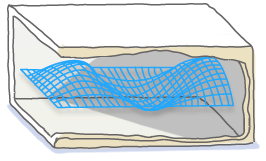 この合成波は、伝播過程で互いに強めあう角度で反射するもののみが残り(導波管の幅広面の長さaに左右される)、違った角度で当たって進む波は打ち消しあって最終的には伝送されなくなる。ある瞬時の導波管内の合成波の伝播イメージを図10.3.2に示すが、導波管の短辺側に接する面での電界は「0」で変化は無く、導波管の長辺の中心線管軸上をピークにした山と谷が時間経過とともに進行方向に移動してゆく、即ち 半円球状の風船が脹らんだり、縮んだりして伝送されるイメージとなる。