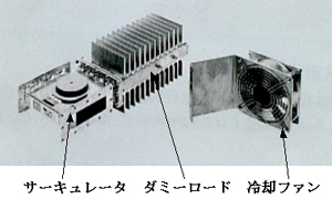 アイソレ-タは、サ-キュレ-タとダミ-ロ-ドより成っており、サ-キュレ-タはマイクロ波発振機からの入射電力と照射部からの反射電力とを、導波管T字部に設けられているフェライトと磁界の作用により分離して(「右ネジの法則」…入射・反射波の磁界方向が180°異なることを利用)、入射電力は殆ど損失無しに照射部へ電送し、反射電力をダミ-ロ-ド側へ分離・導入するものである。反射電力はダミーロ-ドの水(大電力用)或いはサンドロード(電波吸収用焼結体。1.5kWクラスの小電力用)に吸収され、熱となって廃棄される。図11.1.1 は空冷式アイソレ-タの外観を示している。本図ではダミーロードが空冷式なので冷却ファンで冷却するようになっている。大電力用はサーキュレータ、ダミーロードとも水冷式であり、性能を確保する観点からは導波管内部に設けられているフェライトを如何に冷却するかが鍵となる。これはアイソレータの性能は、フェライトの温度に依存することが大きいからである。