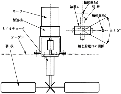 尚、マイクロ波給電口に対するスターラの軸の位置は、図中の(a)及び(b)の場合が考えられる。位置(a)の場合は金属羽根の方向が電界の進行方向を遮る瞬間があり、その場合 非常に大きな反射電力が発生するので、この位置に設けることは好ましくない。