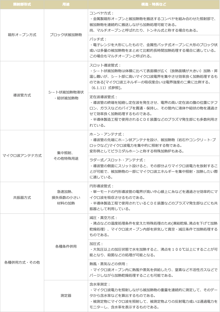 マイクロ波照射部は、被加熱物にマイクロ波エネルギ-を照射し加熱処理する部分だが、被加熱物の形状、性状、材質、処理目的などにより多種、多用のものが開発・実用化されている。表12.1.1 に各種マイクロ波照射部の用途、構造とその特長などを示している。この中で箱形オ-ブンは最も代表的なものであり、典型的な例が家庭用電子レンジとなる。
