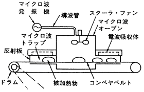 一方、図12.2.1 (b) のコンベヤ式オ-ブンは、被加熱物をベルトコンベヤにて搬送しながら加熱処理するものである。バッチ式オーブンを基本に、オーブンの両側に開口部を設け被加熱物搬送用コンベヤを設置する。オーブンの開口部よりはマイクロ波が漏洩するため、電波吸収体や金属ノレンなどを利用した漏洩マイクロ波エネルギーを吸収するマイクロ波トラップを設けて、作業エリアにおいて安全を確保するようになっている。