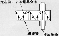 図12.2.5 はラダ-形加熱炉であり、この加熱炉は前述のスロット導波管形加熱炉で得られる電界強度よりも高い電界強度が得られる(50~100倍程度)のが特徴で、ラダ-の上方近傍に被加熱物、例えば本の背表紙や伝票の帳合い部を通過させて、その部分を集中的に加熱するものである。尚、ラダー形加熱炉で得られる電界強度が非常に高いため、塵埃などの異物がラダー面に付着すると放電などの異常が発生し易く、使い難い一面もある。