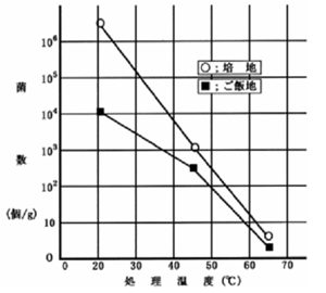 食中毒菌であるブドウ球菌(Staphylococcus aureus )のマイクロ波加熱による殺菌効果を図19.3.2 に示している。これはシャーレにマンニット食塩培地を一定量流し込み、1g当り106 個オーダのブドウ球菌を接種し、マイクロ波加熱したもので、加熱後の温度45~47℃及び63~67℃の検体を比較したものである。その結果、マイクロ波加熱後の温度が65℃であれば菌数106 個オーダ/gであっても、殆ど殺菌することが可能である。又、同じように104 個オーダ/gのブドウ球菌を御飯に接種しマイクロ波加熱を行ない効果を確認したが、前記とほぼ同様な殺菌結果が得られることが判る。