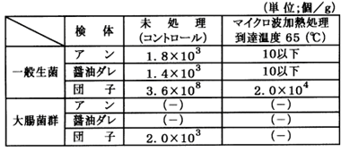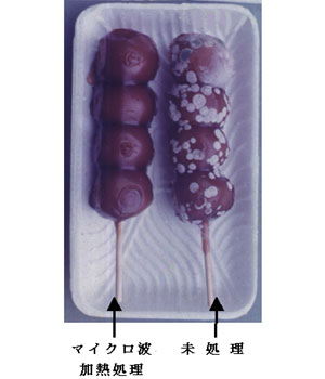 和菓子類の生・半生菓子などの比較的水分の多い菓子は、保存中に一般生菌の増殖、カビの発生或いは大腸菌群の汚染による腐敗の恐れが考えられるが、これを防止するための手段としてマイクロ波加熱処理は非常に有効である。ここでは「朝生類の串団子の殺菌効果」について記述する。串団子は販売当日の朝方作られ、その日の夕方迄に或いは翌日中には販売し終わらなければならない、非常に日持ちの短い業者泣かせの和菓子類と言える。串団子の汚染は、カビ(Aspergillus,Penicillium など)、Bacillus、大腸菌群などがある。