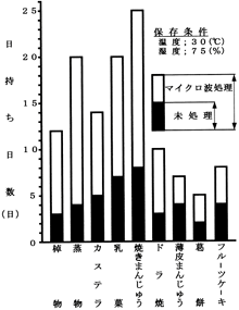 各種菓子類の日持ちが未処理のものに対してマイクロ波加熱したものの方が2~4倍程度長くなることが判る。これらの加熱処理には発振出力数kWのバッチ式マイクロ波加熱装置と数kW~十数kWのコンベヤ形マイクロ波加熱装置が多用されている。
