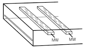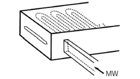 コンベヤベルト幅が1mを超えるような場合、導波管多給電方法での被乾燥物の均一加熱は難しくなります。コンベアベルト幅が広いオーブンには、スロットアンテナ導波管が適しています。図5-3のように導波管の長辺面にマイクロ波を放射するスロットを多数設けたものを、ベルト幅より長くしてオーブンの天井或いは底面側に複数列設けるものです。導波管に切るスロットの位置やサイズを適正にすることで、各スロットよりの放射マイクロ波エネルギー量をほぼ同等にすることができます。コンベアベルト幅が広いオーブンに対してより均一なマイクロ波加熱ができるという利点があります。