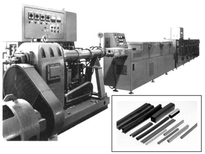 自動車の窓ガラス支持用エッジ・ゴムや配管材断熱用チュ-ブ状発泡ゴムなどの連続発泡・加硫処理を行なっている。これは押出し機より押出された成型ゴムをマイクロ波加熱により加硫温度まで昇温させ、その後二次加熱炉で所定の加硫時間を保持し加硫するもので、断熱材でもあるゴム材を約150℃の加硫温度まで昇温させるのにマイクロ波加熱は有効で、熱風などを併用したものとなっている。発振出力十数kW程度の連続式マイクロ波加硫装置が多用されている。図19.3.20はマイクロ波ゴム加硫装置の外観を、右下は製品例を示す。