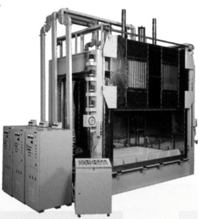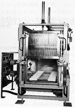 砂型の硬化処理(キュアリング)には発振出力数kW~数十kWのバッチ式やローラコンベヤ式(間欠搬送)装置が、砂型の接着用には出力数kW~十数kWの装置で、砂型同士を圧締する必要があるためプレス機構を内蔵したオーブンとなっている。前頁の図19.3.26はプレス内蔵マイクロ波砂型接着装置の外観を示している。