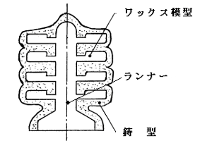 この「鋳物ツリー」は、ワックスで作られた「ワックス模型(例:ヘッドの雄型)を、ワックス製で熔けた金属が流れる湯道である「ランナー」に木の枝状に多数接着した図19.3.28 (a) のようなものである。
