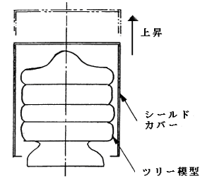 マイクロ波加熱により脱ロウする場合は、内部加熱によりワックスが選択的に加熱されるが、その際ワックスが熱膨張して鋳型にクラックが入ることがしばしば発生する。これを避けるため図19.3.28(b)のようにツリーの下方から順次ワックスを溶かし出すよう、ツリーの上方からシールドカバーを被せ、脱ロウ状況を確認しながら、それを上方へ持ち上げるような工夫を採り入れている。