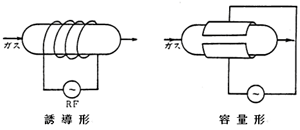 この放電プラズマを持続させる放電(電離)エネルギ-の供給手段として、電波ではマイクロ波エネルギーと高周波エネルギーによるものがある。高周波放電の場合は、発振周波数13.56MHzの電波を利用するものが多く、図20.2.2 にその発生方式が示されている。コイル(誘導形) 或いは電極(容量形)の間にプラズマ発生部があって処理部と一体化されており、被処理物は高周波とプラズマ中に存在するのが特徴である。