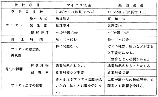 表20.2.1 は高周波プラズマとマイクロ波プラズマの特徴・違いを比較・纏めたものである。