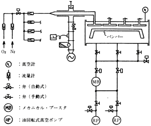 プラズマ処理室は被処理物の種類、形状、処理条件などを考慮して寸法、構造が決められるが、材質は通常ステンレス材が使用される。排気装置は処理装置の系全体を排気するもので、一般的にはル-ツ式或いは油回転式真空ポンプを使用するが、必要に応じメカニカルブースタポンプを併用し排気時間の大幅短縮を図ることもある。制御部は装置構成機器類の集中操作・制御を行うもので、生産ラインの場合には自動運転が行われる。