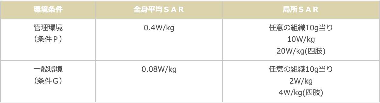 「SAR」は「 Specific Absorption Rate 」の略字で「比吸収率」と称して、単位は「W/kg」となる。 これは体内での熱発生度合いの尺度として用いられるもので、単位質量当りの吸収電力量(単位時間当りの吸収 エネルギー)とも云える。「全身平均SAR」は人体に吸収されるエネルギーの総和の指標となる。一般的には、 安静時の代謝量は「1W/kg程度」、軽い運動で「2.5W/kg」、激しい運動で「10W/kg」となる。 更に、「全身SAR」が「4W/kg程度」になると深部体温が「約1℃」上昇すると見積もられており、健康 への負担になると云われている。尚、携帯電話の場合は以下の通りである。