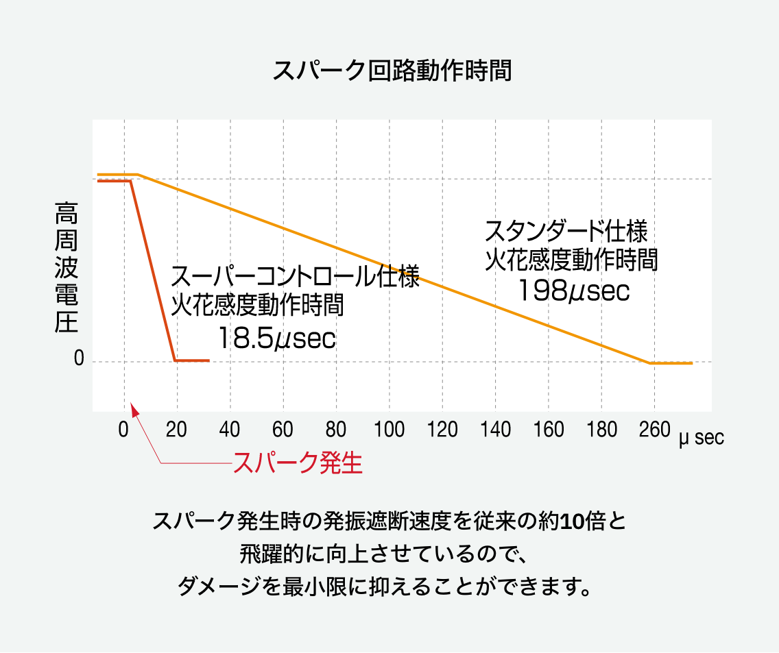 高周波をコントロールする上で、どうしても向き合わなければならないのが、「スパーク」の問題です。加熱させる材料の耐電圧を超える高周波電圧を加えると「スパーク」が発生します。仮に金属などの異物が混入していても「スパーク」発生の原因となることから、発生した際のダメージを最小限に抑える必要があります。そこで超高感度スパーク遮断システムが機能します。