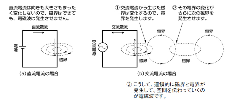 交流電流からも同じように磁界が発生しますが、この磁界の向きや大きさは交流電流の向きや大きさに同調して絶えず変化します。そして、磁界が変化するところには必ず電界が発生します。さらに、この電界も元の磁界の変化に同調して変化するので、それがまた次の磁界を生みます。このように、交流電流から発生した磁界は電界を生み、その電界がさらに次の磁界を生むという連鎖が生まれ、空間を伝わっていきます。この現象、すなわち、電界と磁界が交互に相手を発生させ、その連鎖が波となって空間を伝わっていく現象が電磁波です。