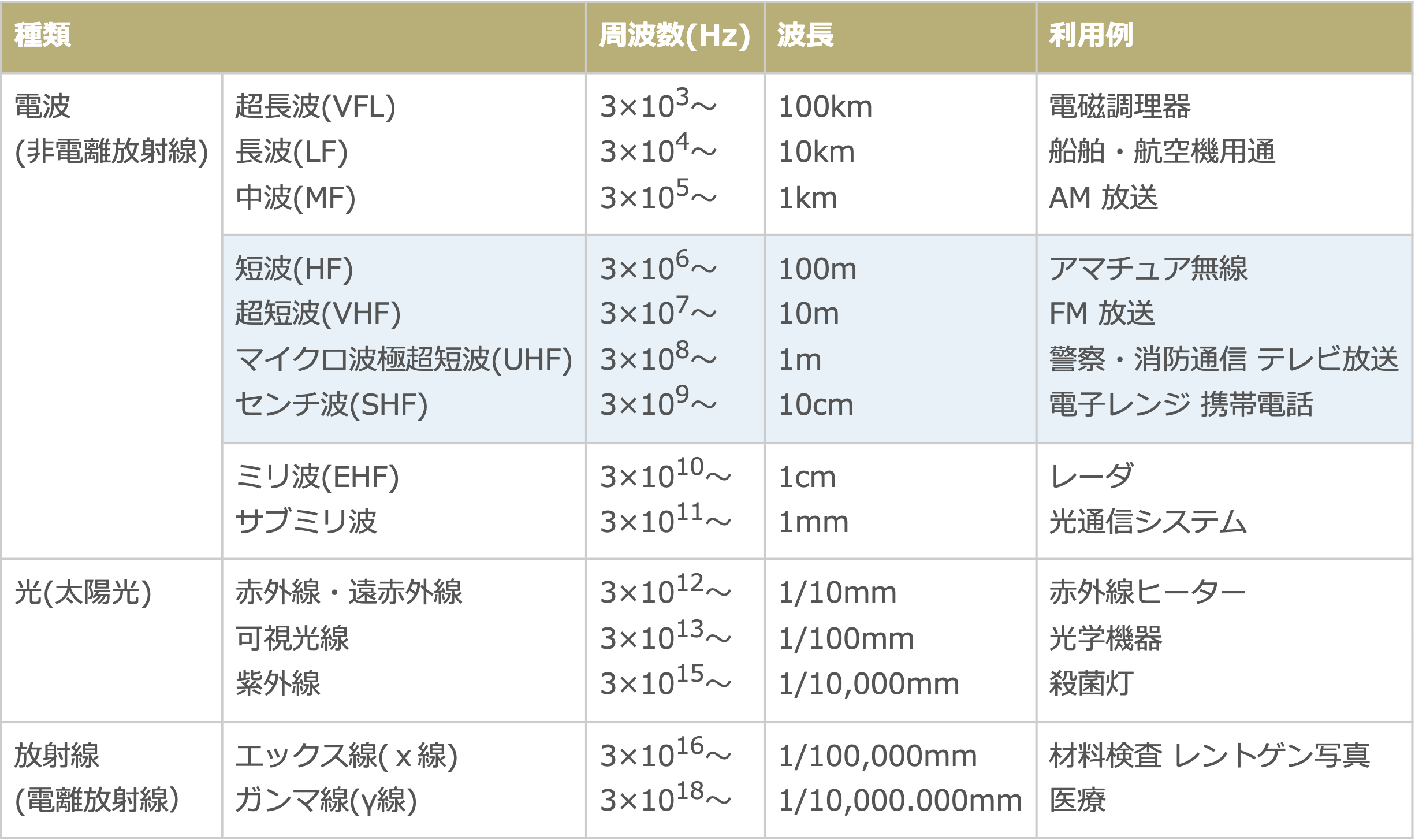 表2-3-1/周波数の違いによる電磁波の種類と利用例