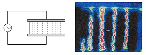 前ページの(表3-7-1)でみたように、損失係数は誘電体の種類によって違っています。発熱量は損失係数に比例するので、単一の誘電体ではなく、異なるいくつかの誘電体から構成されている物体に高周波電圧をかけると、各誘電体の発熱量は不均一になります。