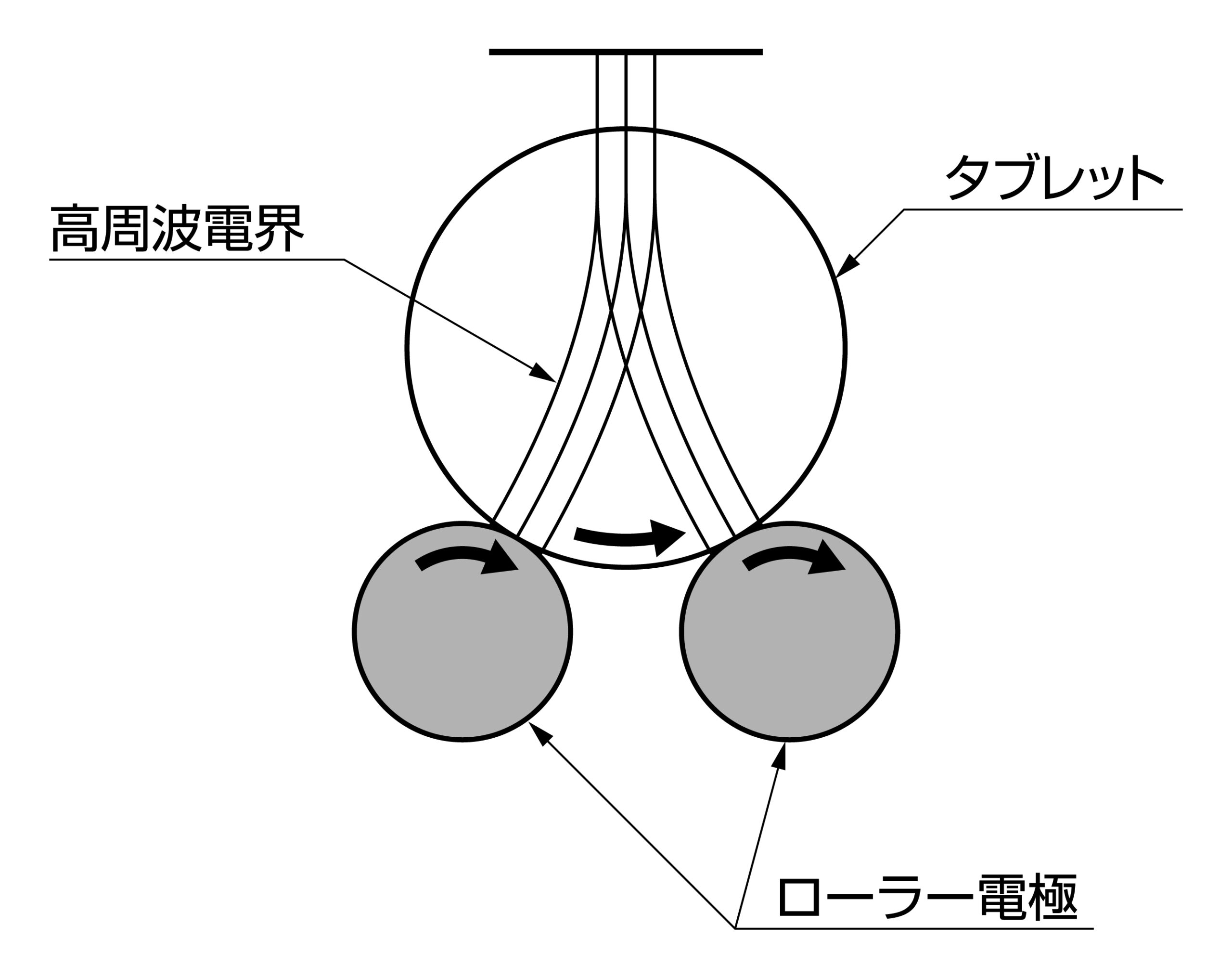 高周波プレヒータの電極構造には平行平板電極とローラー電極がありますが、ローラー電極はタブレットを高周波電界中で回転させて加熱するので(図7-3-1)、均一予熱と急速高温予熱(上部電極形状により電気力線が集中される)できるのが特長です。また、最近の半導体製品のモールド用に使われるプレヒータでは成形品の品質向上が大きく求められるため、予熱中の温度管理が重要となります。そのため、赤外線温度計を装備して、タブレットの温度が設定温度になると自動的に予熱が停止される方法が採用されています。
