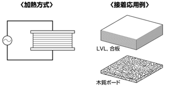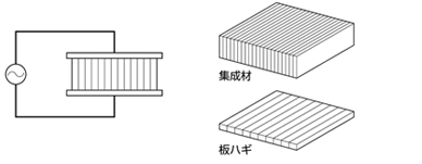 全体加熱方式と同様に平板平行電極で被加熱物を挟み高周波を印加しますが、接着層は電極板と垂直にします。接着層に高周波電界が強く集中するので、木質材料自体をあまり加熱することなく、接着部のみを効率よく選択加熱できます。接着でもっとも広く利用されている方式です。