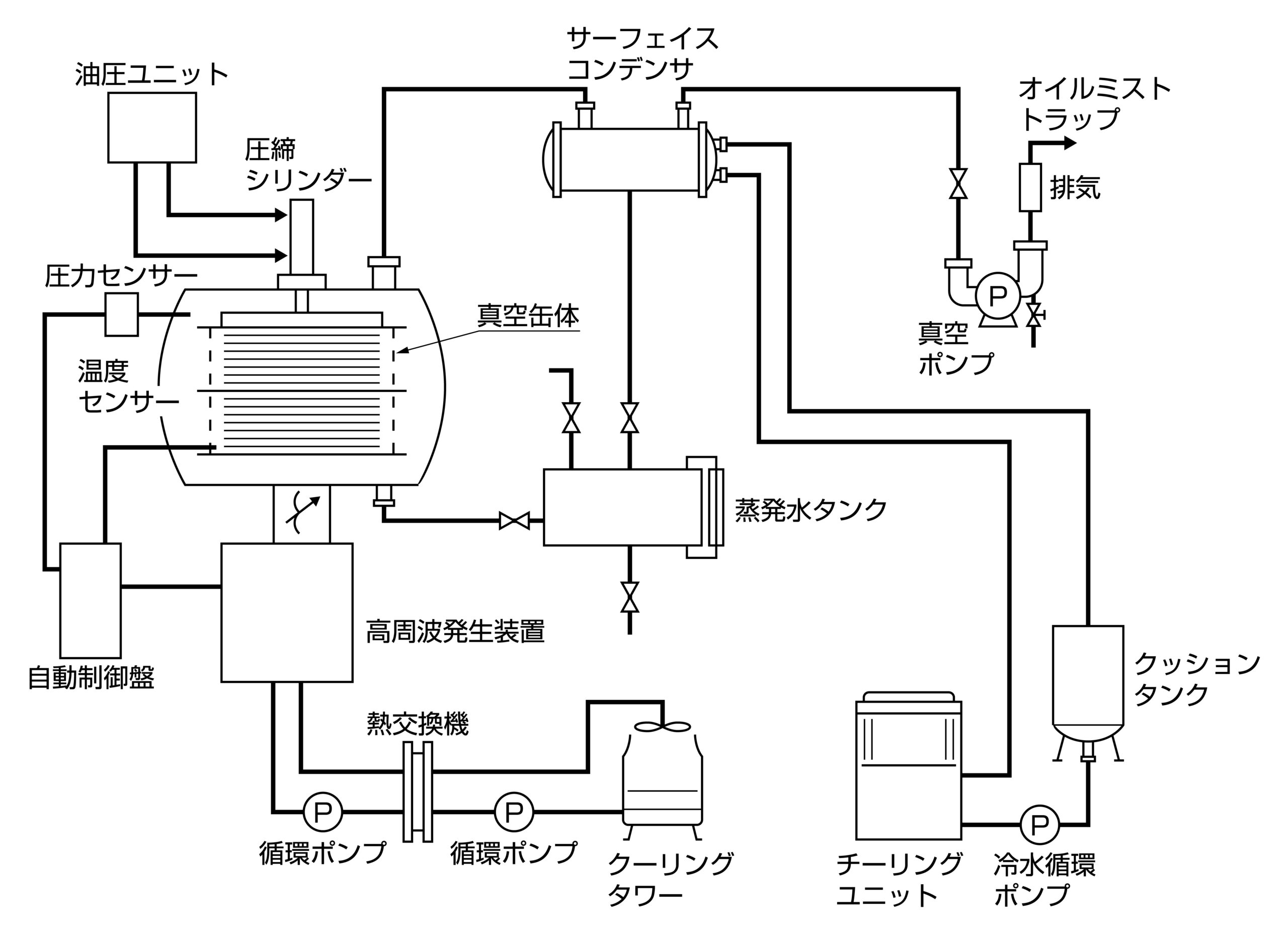高周波減圧乾燥装置は、缶体、真空ポンプ、高周波発振器、極板、冷却器、材温の測定と温度制御をする装置などから構成されています。機械配置図は(図7-6-2)です。
