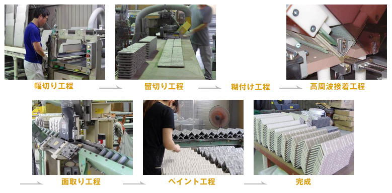 サイディングプレカットによりカットされた廃材は、住宅外壁の角に当たる部分であるコーナー材に使用することができます。これにより廃材が最小限となり、コストダウンに寄与しています。外壁出隅材と呼ばれるコーナー部材は、主に廃材を利用し板形状の窯業系サイディングの端面を所定の角度にカットした者同士を突き合わせて形成したものです。外壁出隅材の接着のほとんどは、加工が速く、接着精度が高い高周波誘電加熱で加工されています。以下に加工工程を示します。