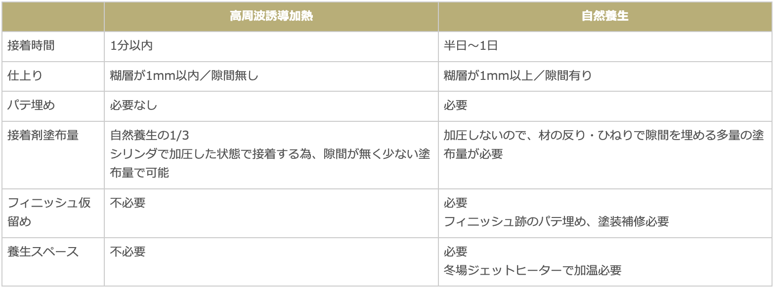 外壁出隅材の加工接着に利用される高周波接着機は、大きく①短尺スタンダードタイプ、②短尺高機能タイプ、③長短兼用量産タイプ、④長尺メインタイプに分類されます。使用される周波数は、主に40.68MHz、27.12MHzです。高周波出力は、短尺用で3kW~5kW、長尺用で15kW~30kWです。板材同士を正確に合わせ精度よく接着するために、水平方向の左右から側圧をかけながら上下の高周波電極により接着層を挟み込んで、選択加熱により接着剤を硬化させます。また、接着剤の使用量が少ないため、余分な接着剤のはみ出しがなく、綺麗な仕上がりとなることもメリットです。以下に高周波誘電加熱による窯業系外壁出隅材の加工メリットについて自然養生と比較します。