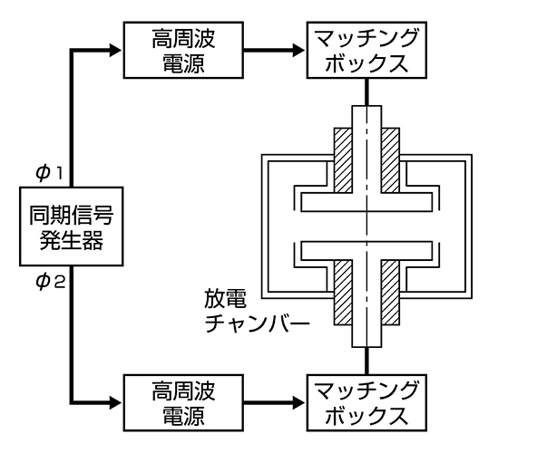 スパッタは、ターゲットに高電圧のDCや高周波を印加することが基本ですが、製膜の品質を向上するためにサブプレートにもDC、または高周波を加えて、製膜する方法もあります。サブスレートへの印加は、スパッタの前にサブストレートのみの印加でおこなうクリーニングを主目的とした場合と、スパッタ中に同時におこなう場合とがあります。スパッタ中同時におこなうものをバイアススパッタといいます。ターゲットとサブストレートの両方に高周波を印加する場合には、干渉の問題があるので注意が必要です。普通は、1台の基準発振器からの信号で2台の高周波電源を動かし、周波数をまったく同じものとし、なおかつ、位相もコントロールすることにより安定した放電が可能となるように配慮しています。その構成を(図7-10-2)に示します。