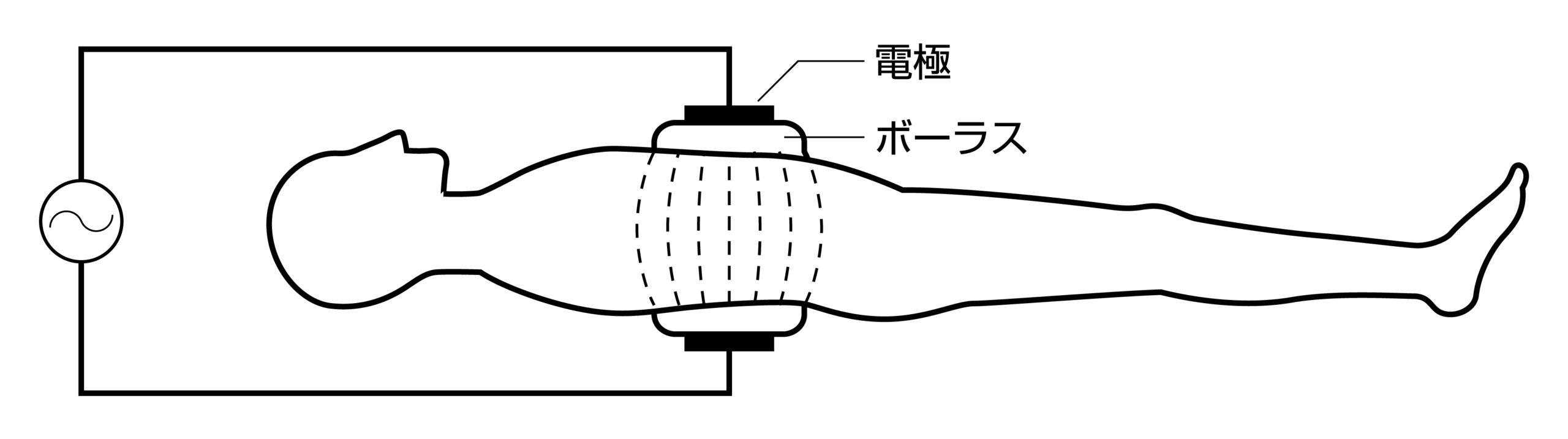 - 高周波電流は皮下脂肪や筋肉を突き抜けるように流れるため、抵抗の大きな脂肪層の発熱が大きくなります。しかし、皮下脂肪は体表に近いので、ボーラス内を還流する冷却水によって冷却できます。