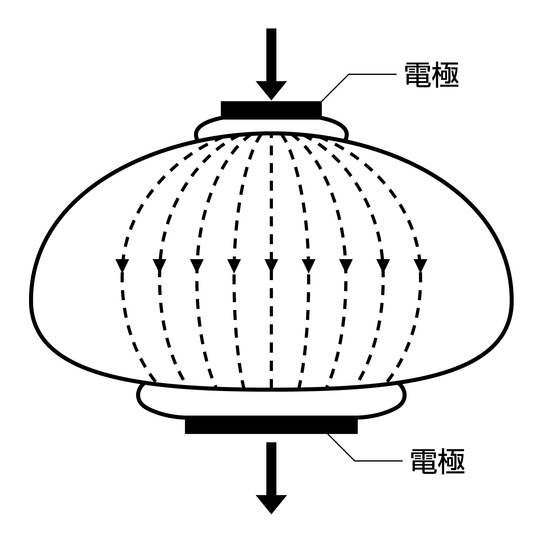 - 身体の厚み(電極間隔)より電極サイズ(電極直径)が大きい場合、高周波電流は生体内をほぼ均等に流れるので、その結果、深部加温が可能になります。通常、電極サイズは20cmφ~30cmφと身体の厚みより十分に大きなものが用いられます。