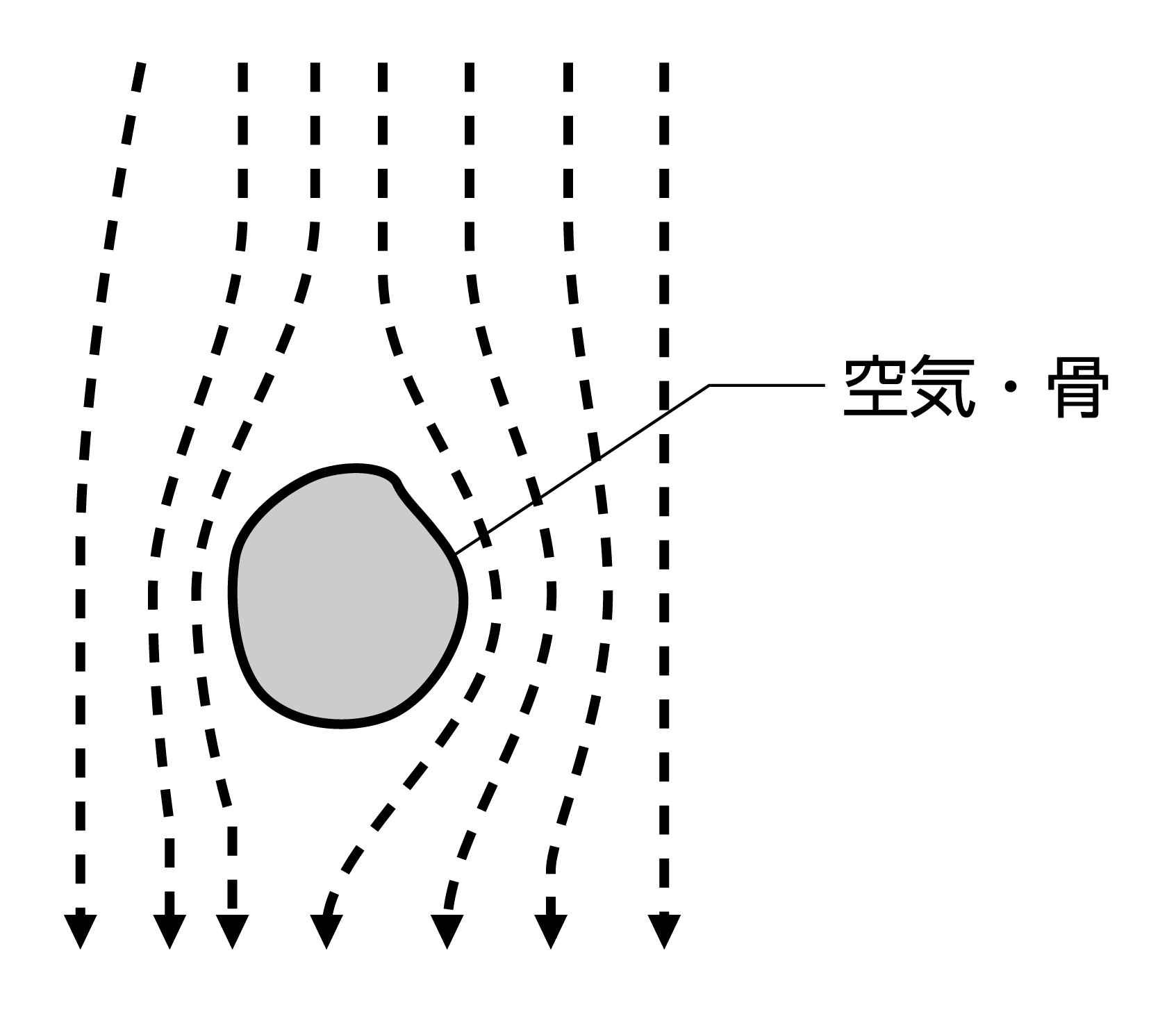 - 空気層や骨があると、高周波電流はそこを避けるように流れるため、電流が集中して発熱量が大きくなる部分が発生します。それをできるだけ避けるために、電極やボーラスの配置に工夫が必要です。(図7-12-3)