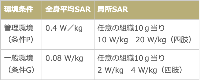 表にある「SAR」とは「Specific Absorption Rate」の略で「比吸収率」といい、生体が電磁界にさらされることによって単位質量の組織に単位時間に吸収されるエネルギー量を表します。単位は「W/kg」です。SAR を全身にわたり平均したものを「全身平均SAR」、人体局所の任意の組織1g または10g において平均したものを「局所SAR」といいます。